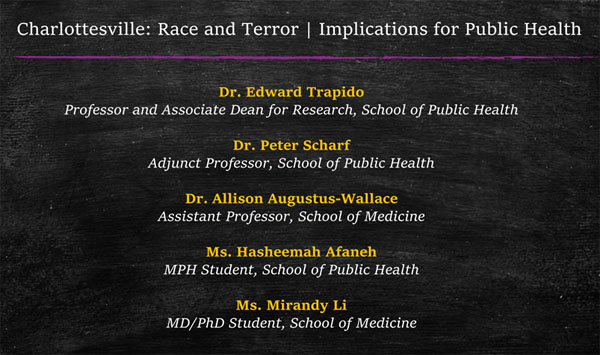 In response to the Charlottesville event and its political aftermath, the School of Public Health’s Public Health Practice and Community Engagement Office took the lead for Louisiana State University Health Sciences Center and hosted Charlottesville: Race and Terror. The event consisted of viewing the Vice news documentary of the same title and a panel discussion comprising faculty and students from the School of Public Health and School of Medicine. Students, faculty, and staff from multiple health professional schools and alumni attended to support their alma mater and join in the discussion.