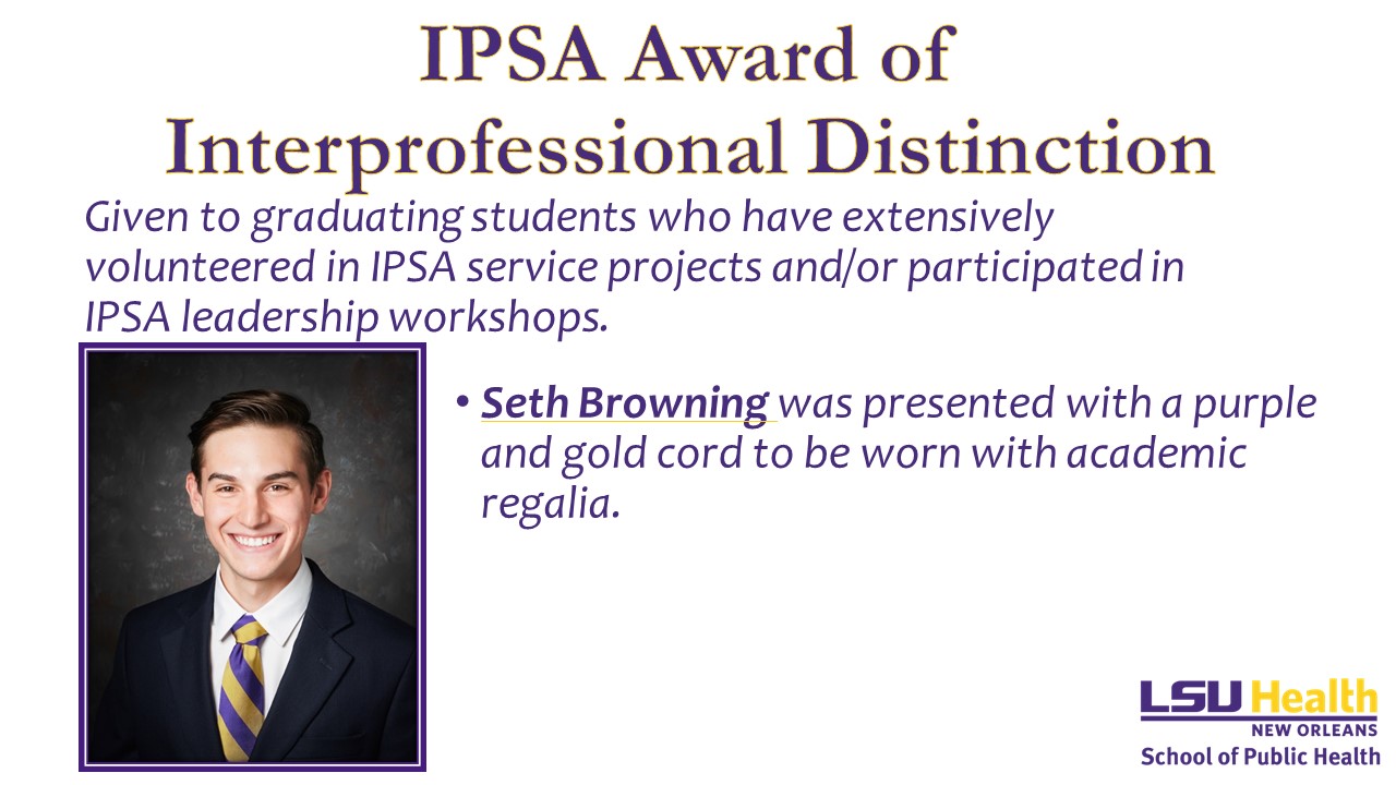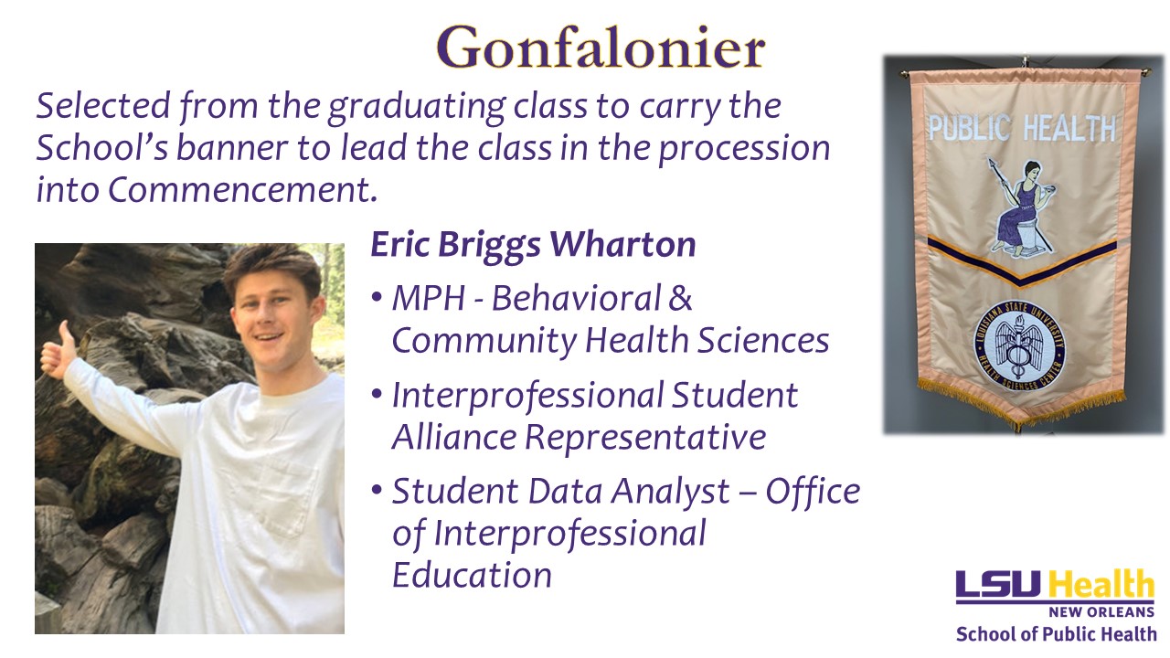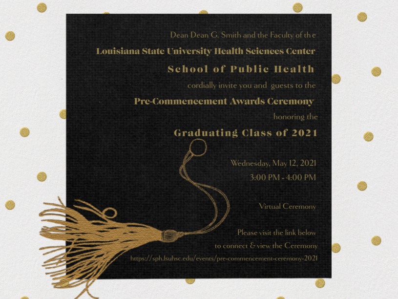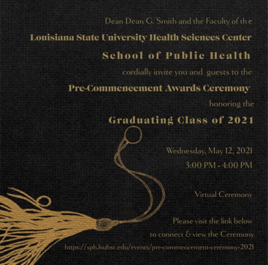 The LSU School of Public Health and the Graduating Class of 2021 held its ceremony on Wednesday, May 12, 2021 at 3:00 PM – 4:00 PM CT.