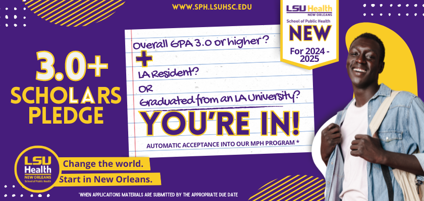 By participating in the Louisiana 3.0+ Scholars Pledge, students will benefit from a streamlined admissions process and immediate entry into a rigorous and supportive academic environment dedicated to advancing public health.