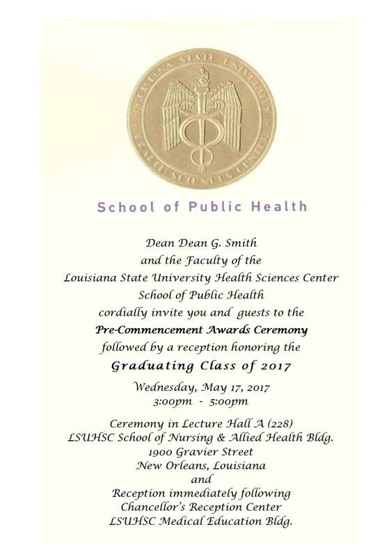 The School of Public Health will celebrate its Pre-Commencement Awards Ceremony and the LSU Health Sciences Center Commencement 2017 to recognize the graduating class’ accomplishments along with the faculty, staff, students, family and friends.