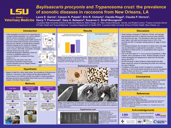 Laura E. Garcia, 3rd year Veterinary Medicine Student from LSU Baton Rouge and summer research intern to Dr. Susanne Straif-Bourgeois, Epidemiology faculty in the LSUHSC School of Public Health, presented her findings at the National Veterinary Scholars Symposium (NVSS). The NVSS is a premier annual scientific colloquium which showcases research accomplishments by veterinary students completing summer research internships. The symposium highlights the ways veterinary scientists advance basic and applied biomedical and environmental research. This year’s symposium was held at the National Institutes of Health (NIH) headquarters in Bethesda, Maryland. The major themes of the meeting were neuroscience, global health, conservation medicine, and comparative oncology. Presentations from veterinary students were featured throughout the meeting, and included a student-focused session on professional development. Laura Garcia’s presentation, Baylisascaris procyonis and Trypanosoma cruzi: the prevalence of zoonotic diseases in raccoons from New Orleans, LA focused on the expansion of raccoons into urban populations and the spread of disease in their role as vectors.