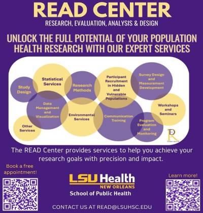 The LSU Health New Orleans School of Public Health is excited to announce the launch of the Research, Evaluation, Analysis, and Design (READ) Center. This center provides a wide range of services to support researchers both within and outside the institution in advancing population health research.