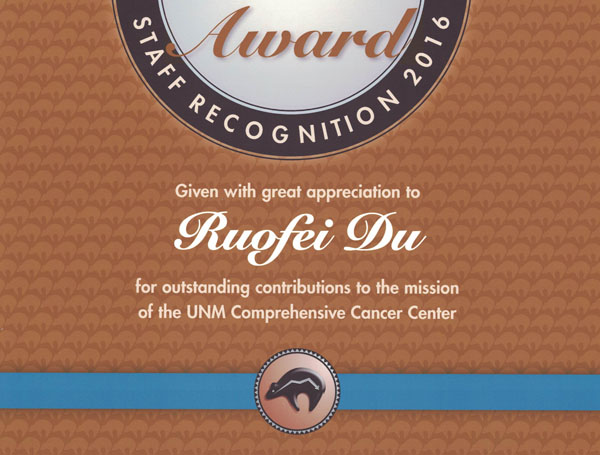 School of Public Health alumnus Ruofei Du received staff recognition award for outstanding contributions to the mission of the UNM Comprehensive Cancer Center.
