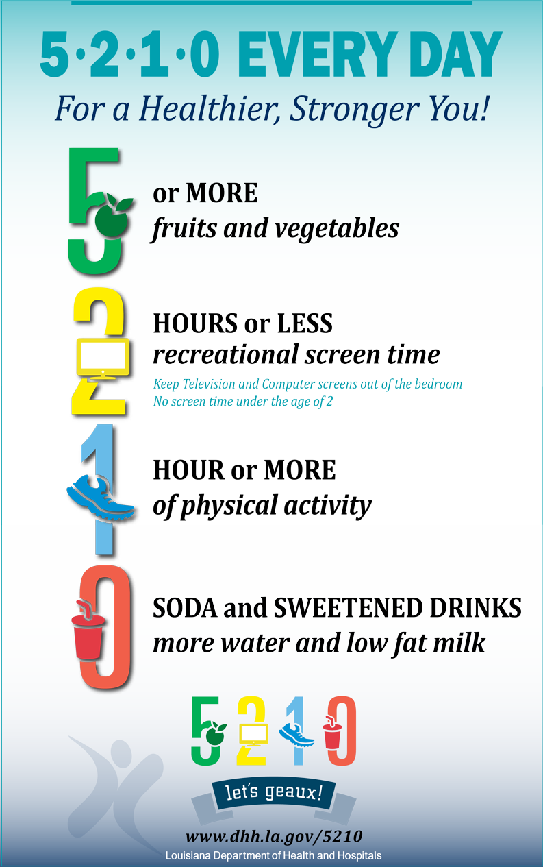 The Well Ahead LA program promotes and recognizes voluntary changes in the spaces and places where we live and work every day that make it easier for us all to live healthier, happier lives. LSU currently has a tobacco free policy to combat the serious health risks associated with the use of tobacco products, both to users and non-users. You will soon notice colorful “5-2-1-0” posters displayed in our workplace. Let’s Go! Is a nationally recognized program to promote the environments where we work. “5-2-1-0” stands for: