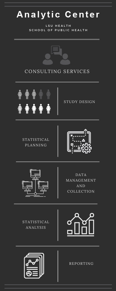 Our mission at the Analytic Center is to facilitate high quality health-related research at LSU Health and affiliated research groups at other institutions through consultations, collaborative relationships, and broad-based services in research design, data collection & management, and statistical analysis. The Analytic Center is available to assist in the production and completion of research projects on a fee-for-service basis where cost may vary depending upon on size , scope, and time of services utilized. Cost considerations will also include type of project and investigator status.